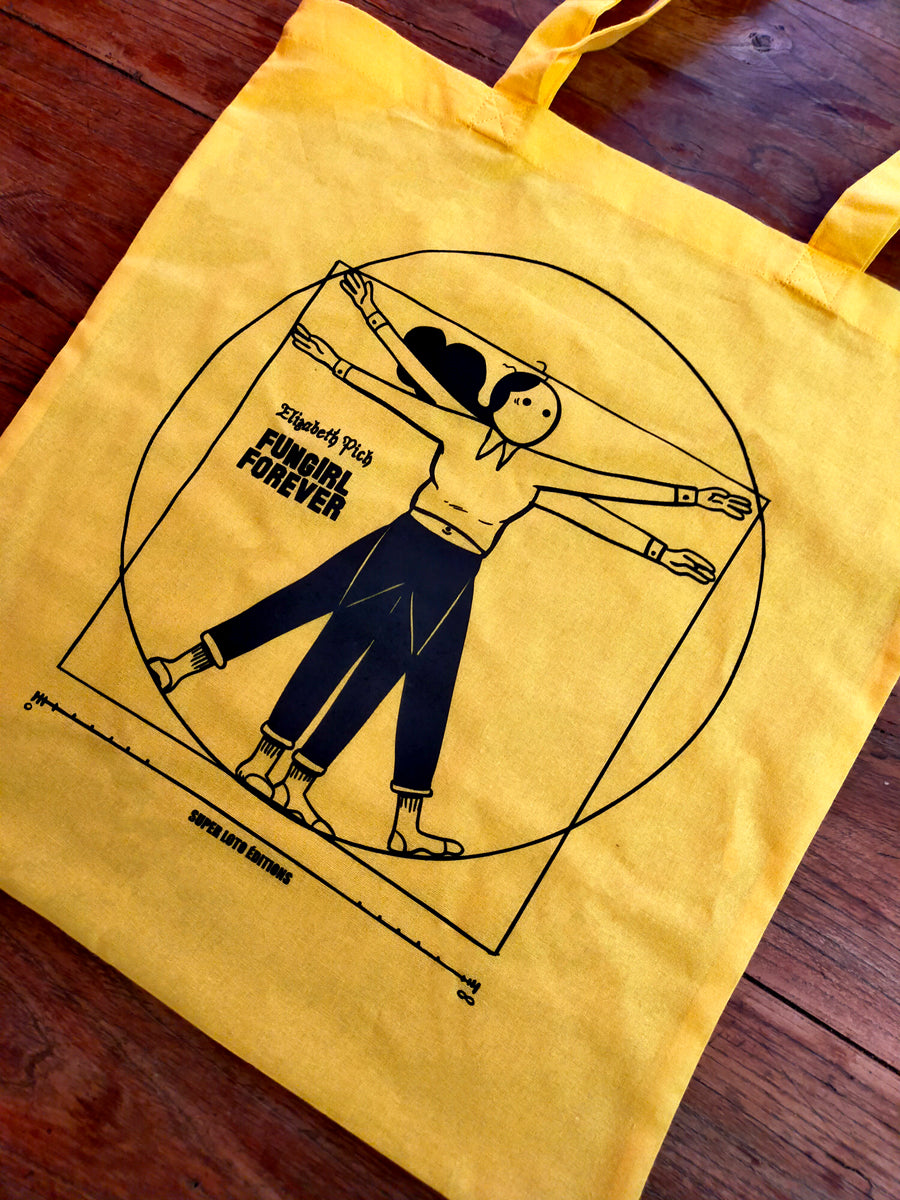 This bag is silkscreen black on vibrant yellow, 100% cotton. It measures 38 x 42 cm.